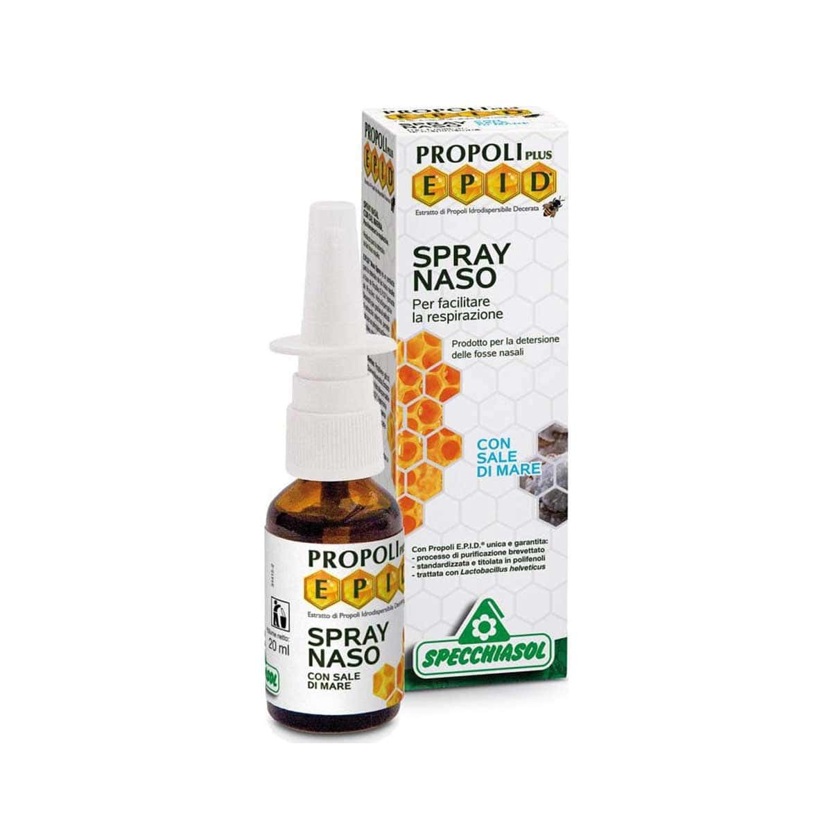 Το EPID Nasal spray της Specchiasol αποτελεί ένα ιατροτεχνολογικό προϊόν το οποίο περιέχει αλόη, μολόχα, χαμομήλι και θαλασσινό αλάτι. Ομαλοποιεί της ρινικές εκκρίσεις και ενισχύει την υγιεινή του ρινικού βλεννογόνου. Επιπλέον το συγκεκριμένο σπρέι δίνει ευχάριστη αίσθηση φρεσκάδας χάρη στα αγνά αιθέρια έλαια που περιέχει όπως ευκαλύπτου, μέντας και πεύκου. Πιο συγκεκριμένα οι ρητίνες και οι συστατικά όπως το γλυκερινικό εκχύλισμα πρόπολης, το εκχύλισμα αλόης, τα αιθέρια έλαια και η Μυρρίς δημιουργούν ένα φιλμ που ενυδατώνει τους βλεννογόνους προστατεύοντας τους από ερεθισμούς, εμποδίζοντας την επαφή με μικροβιακούς παράγοντες. Το Αιθέριο έλαιο ευκαλύπτου συμβάλλει στην απομάκρυνση των ρινικών εκκρίσεων και στη διατήρηση ανοικτών των ρινικών διόδων και το θαλασσινό αλάτι ρευστοποιεί τη βλέννα ώστε να είναι ευκολότερη η απομάκρυνσή της. Το προϊόν δεν περιέχει αποσυμφορητικά αγγειοσυσταλτικά, δεν ξηραίνει το βλεννογόνο, και δεν προκαλεί ερεθισμό. Για το λόγο αυτό είναι κατάλληλο για συχνή χρήση κατά τη διάρκεια της ημέρας και από παιδιά ηλικίας 3 ετών και άνω.